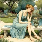 A serene scene of a woman in a flowing blue dress, sitting by a tranquil garden pond surrounded by vibrant flowers. The lush greenery and blossoms create a peaceful, idyllic atmosphere.
