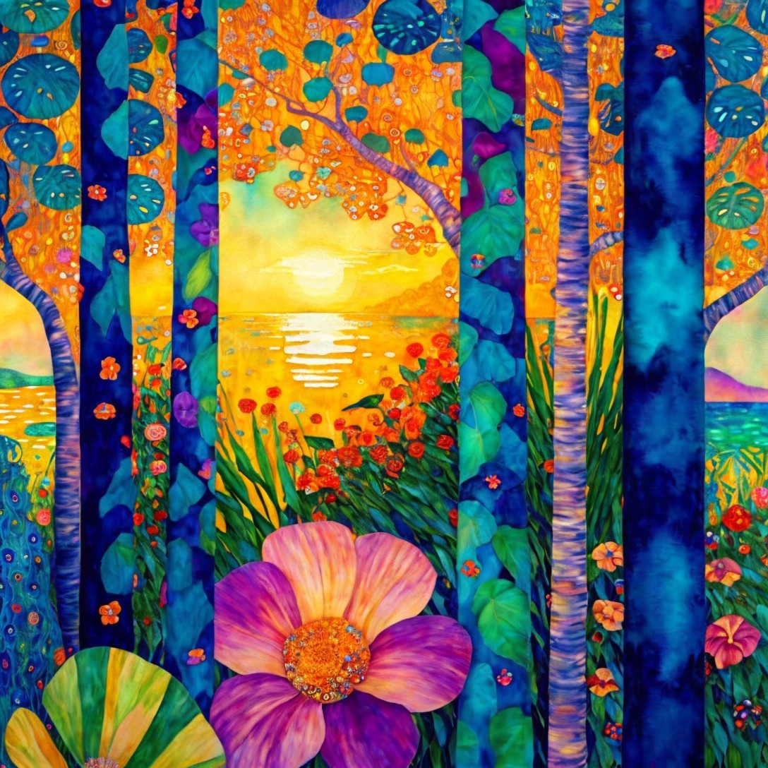 Prompt: Full page, single image, 3D watercolor patchwork, in the very best style of Gustav Klimt, of a spectacular sunrise over a beautiful Tingatinga garden with tropical flowers with vibrant saturated colors, desaturated color trees, delicate plants with leaves in shades of azure blue and teal, lacy ferns, golden sunrise rays shimmering over the scene, intricate, satiny, high quality, elegant, highly detailed, glistening magic style, with elements in the style of Jan Toorop, with subtle elements in the style of Tingatinga