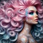 A stunning model with vibrant pink and blue hair cascading in curls showcases bright eyes and bold makeup. Her skin glistens with droplets, creating a whimsical, dreamy aesthetic.