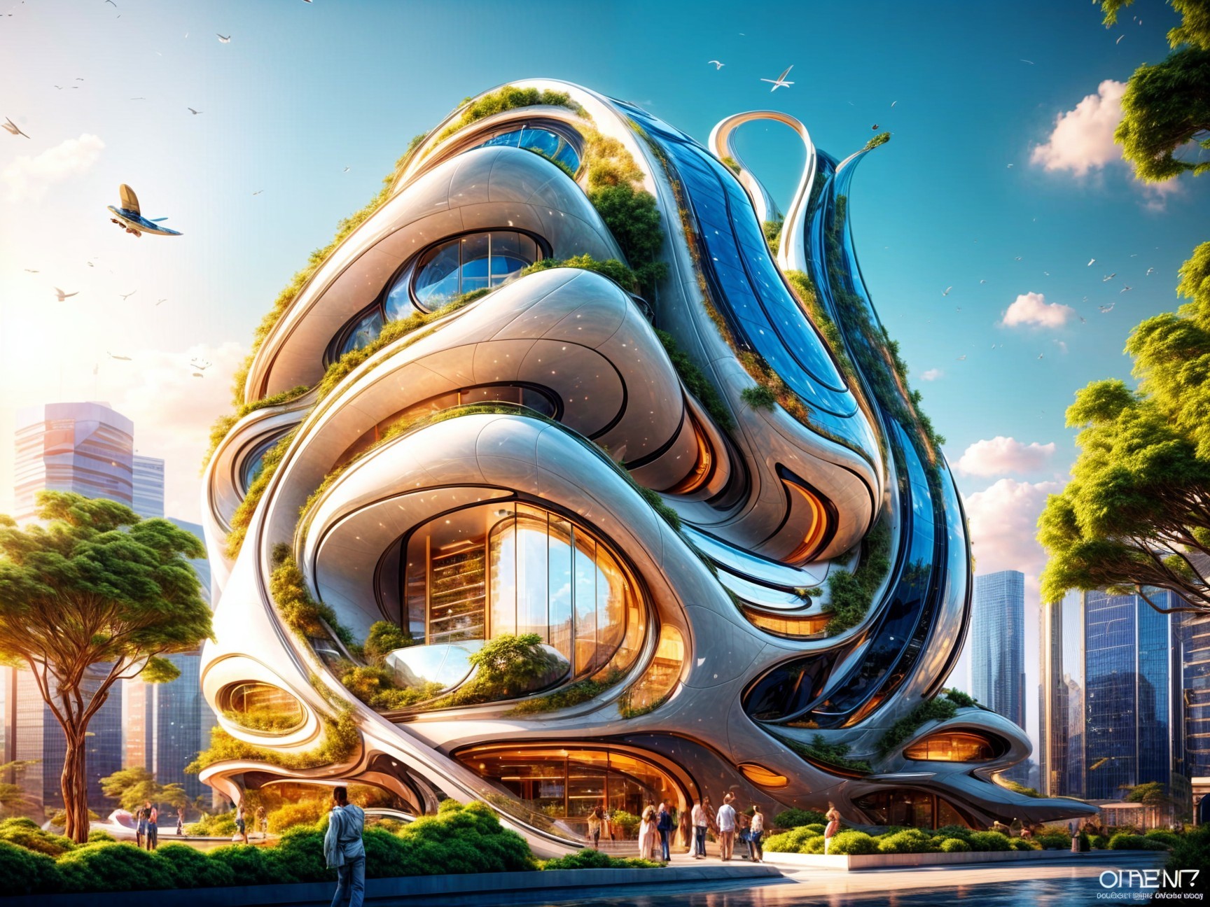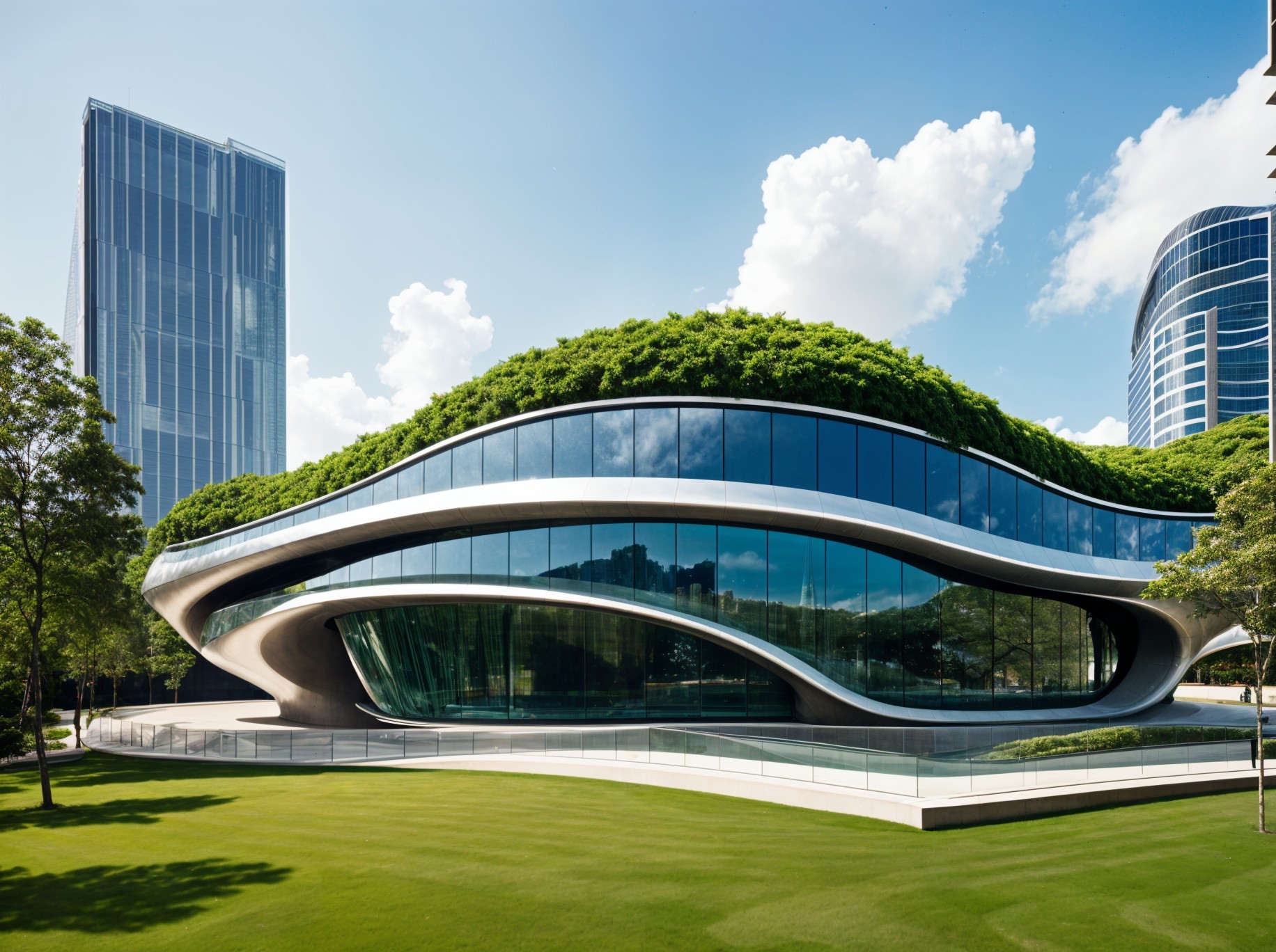 A modern architectural marvel featuring a wavy green roof, large glass windows, and a sleek, curved design, set against a backdrop of lush greenery and a tall, contemporary skyscraper.