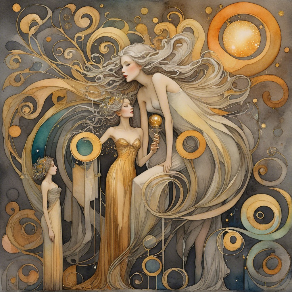 The image features ethereal figures, elegantly dressed in flowing garments, engaged in a mystic gathering. Celestial motifs, soft colors, and golden accents create a dreamy atmosphere.