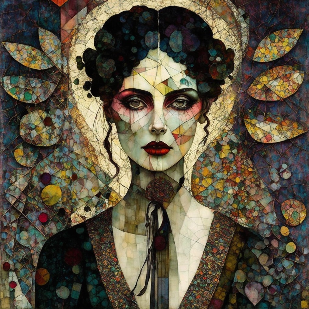 A portrait of a stylized woman with a patchwork design, featuring geometric shapes and a muted color palette, with a vintage feel.