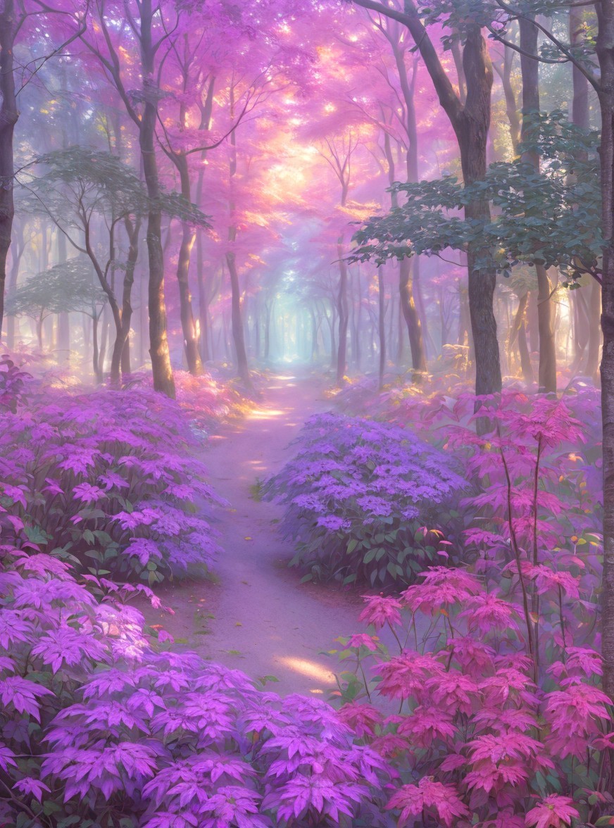 A serene forest path lined with vibrant purple foliage, bathed in soft morning light. Delicate mist adds an ethereal quality to the tranquil scene, inviting peaceful exploration.