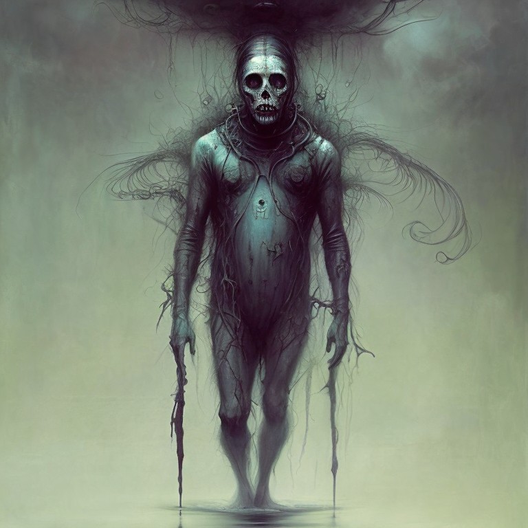 Illustration of figure in gas mask with smoke tendrils, holding chain