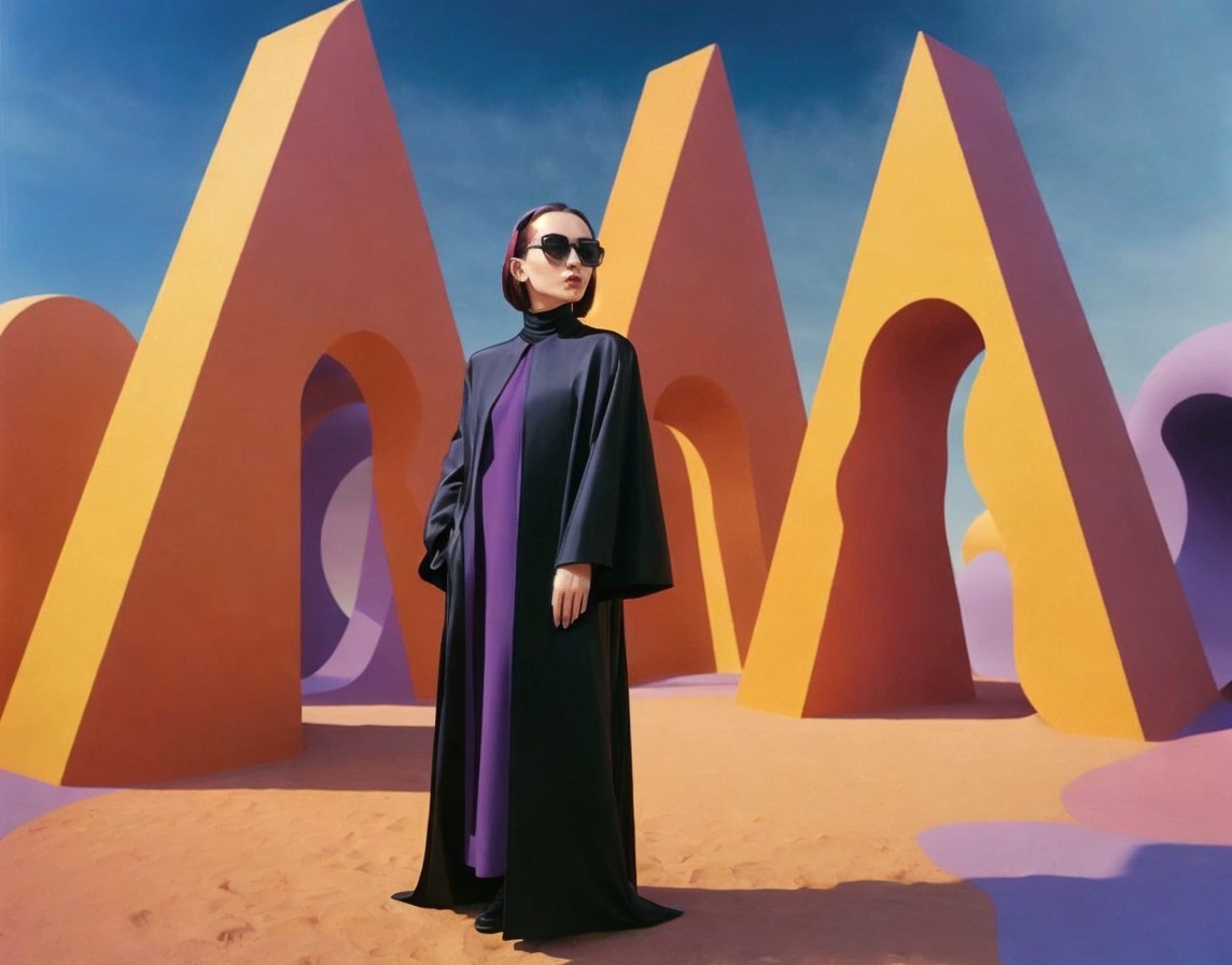 + Prompt:A person standing confidently in a surreal landscape with large geometric letters, casting imposing shadows under a bright blue sky. The individual is wearing a stylish, high-collared long black coat and sleek sunglasses, exuding a mysterious and fashionable aura. The ground is a vibrant pastel orange, complementing the purple and pink hues of the abstract shapes around, creating a bold and striking color palette.