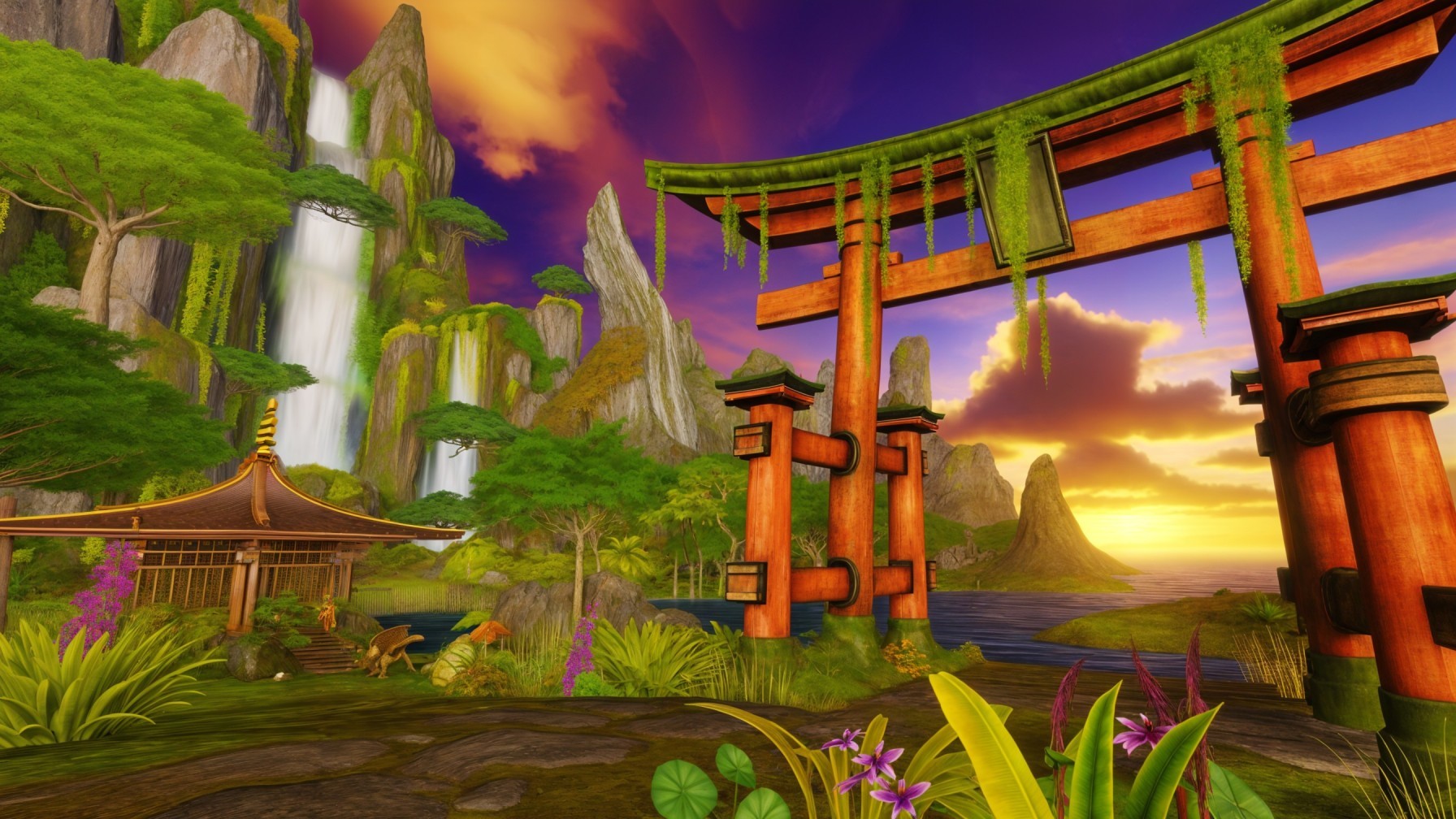 The scene features a tranquil Japanese landscape with traditional red pagodas, vibrant autumn foliage, and glowing lanterns, creating a serene atmosphere illuminated by warm light at night.
