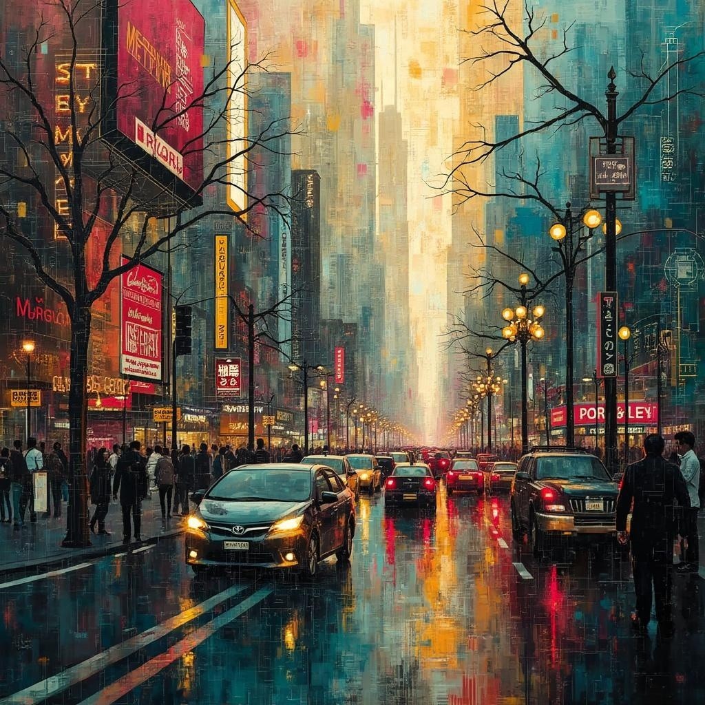 A vibrant cityscape with tall skyscrapers and colorful lights. People walk along a reflective street, while cars navigate through the bustling atmosphere under a bright, hazy sky.