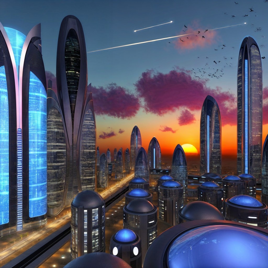 A futuristic cityscape at sunset, featuring sleek skyscrapers with glowing blue accents. Curved structures and a vibrant network of roads illuminate the scene, creating a mesmerizing skyline.