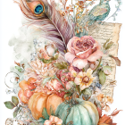 A vibrant autumn scene features orange pumpkins nestled among lush floral arrangements, including roses and daisies, accented by a peacock feather and a colorful peacock, evoking cozy seasonal charm.