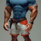 A muscular man stands confidently, showcasing oversized biceps and a broad chest. He wears a fitted blue shirt and orange-accented shorts, coupled with sturdy boots, exuding strength and power.