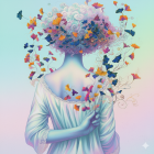 A serene woman with vibrant blue curls wears a floral crown adorned with butterflies. Surrounded by orange monarch butterflies, she holds a fan, radiating a tranquil, ethereal beauty.