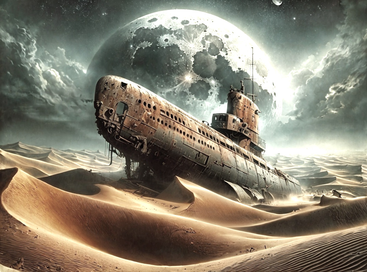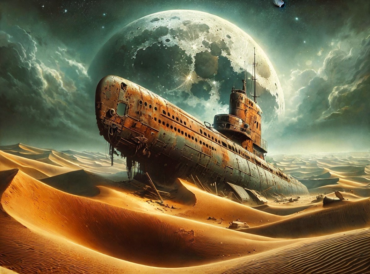 A shipwrecked submarine lies in a desert with dunes under a large moon in the sky, creating a surreal sci-fi scene.