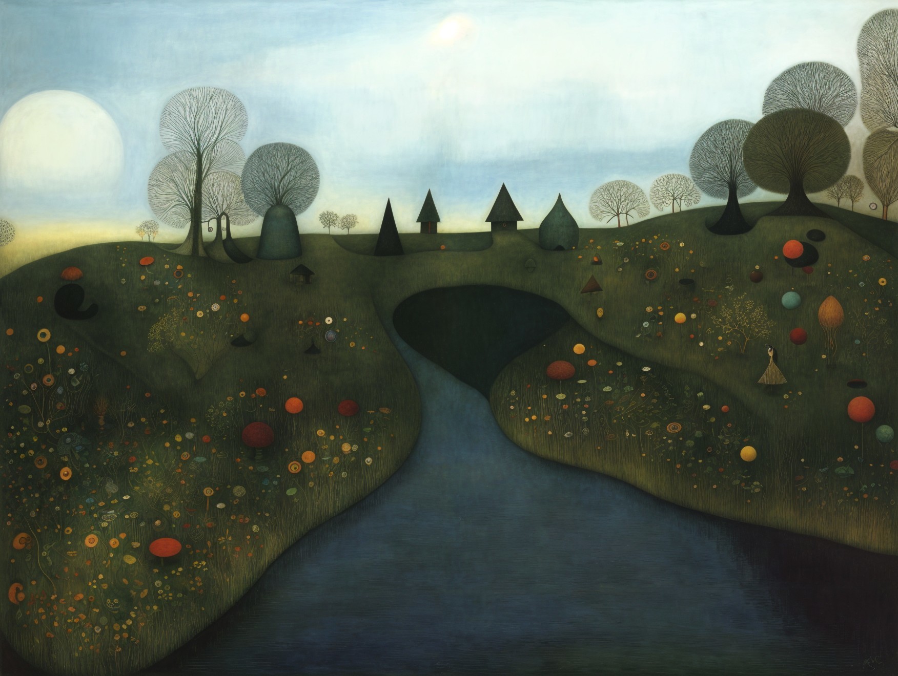 A serene twilight scene depicts quaint, cozy cottages with glowing windows along a winding road. Silhouetted trees and gentle hills create a tranquil, inviting atmosphere.