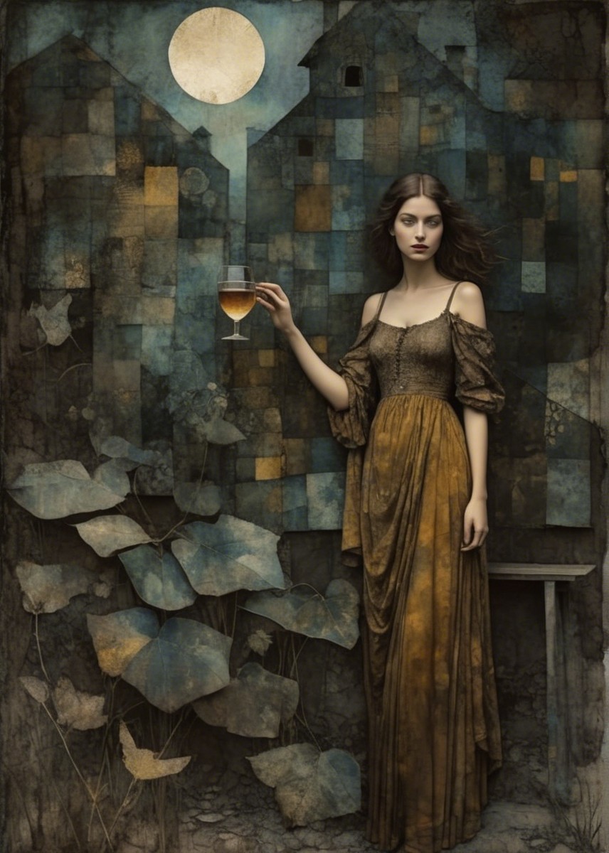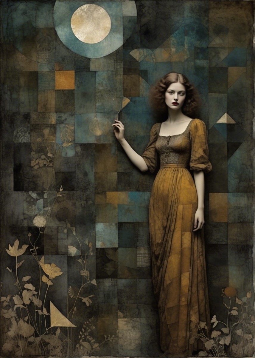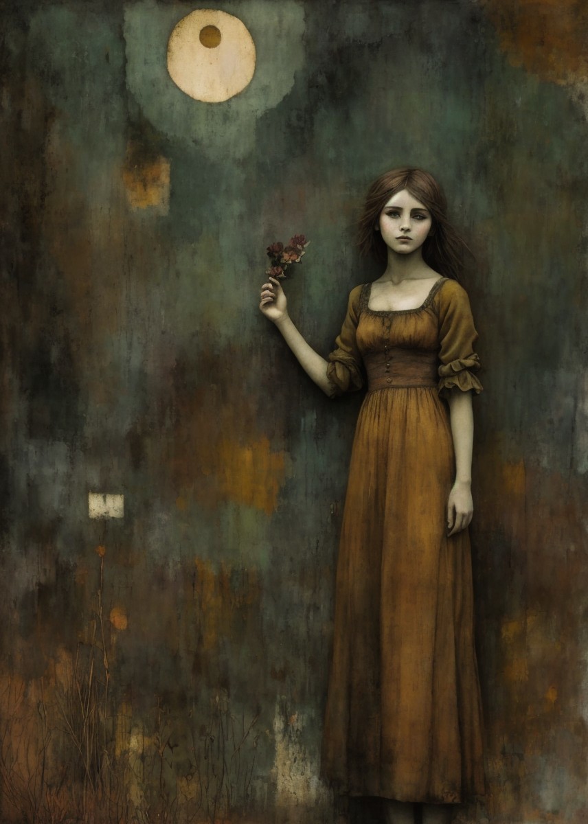 A solemn girl in a vintage brown dress stands against a textured, muted background. Delicate flowers and a golden moon add a whimsical, dreamlike quality to the scene.