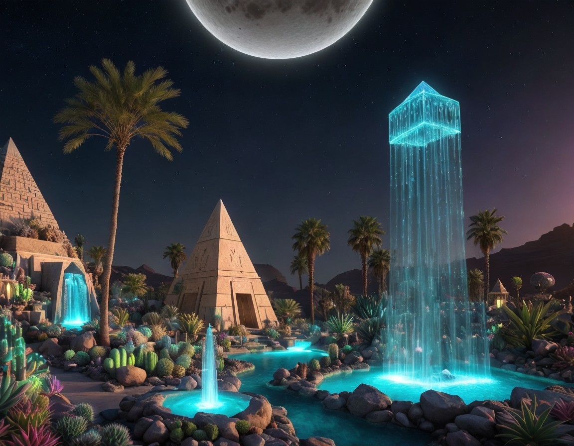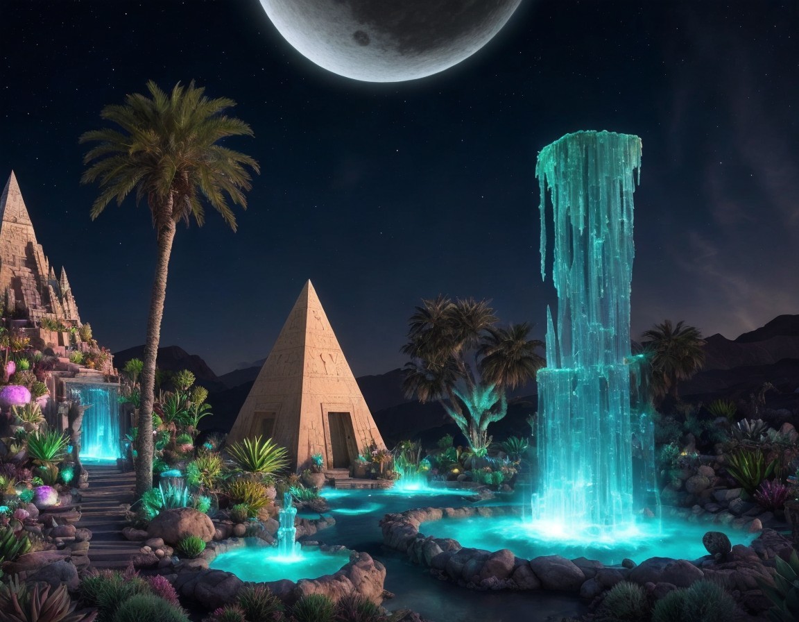 A fantastical scene with glowing, geometric structures resembling pyramids under a night sky with a large moon and a shooting star.