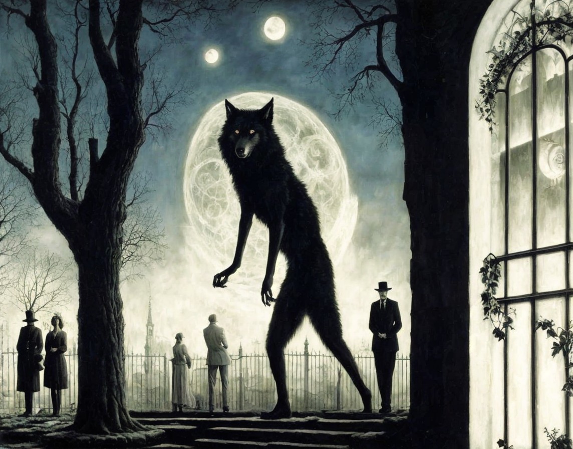 Dark Victorian Graveyard with Shadowy Wolf Under Moon