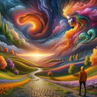 A vibrant landscape features a winding path leading toward a brilliant sunset, with swirling clouds and colorful foliage. A lone figure stands in awe, immersed in nature's stunning beauty.
