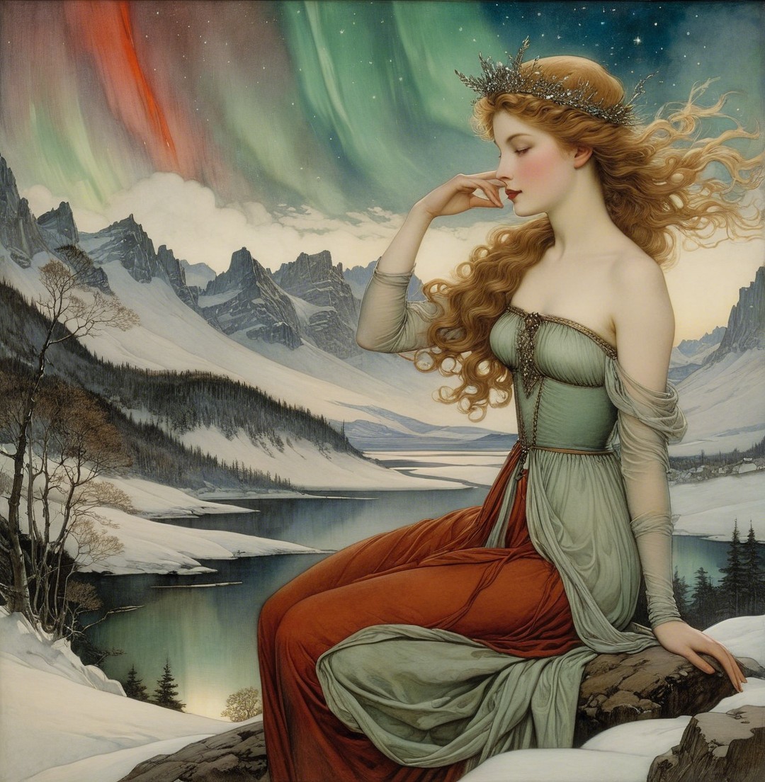 A beautiful woman with long, flowing blonde hair is seated on a snowy rock, adorned with a silvery crown. She wears a strapless emerald green corset with golden and red accents, paired with a long, flowing orange skirt. Her left hand gently holds a lock of her golden hair, which shimmers