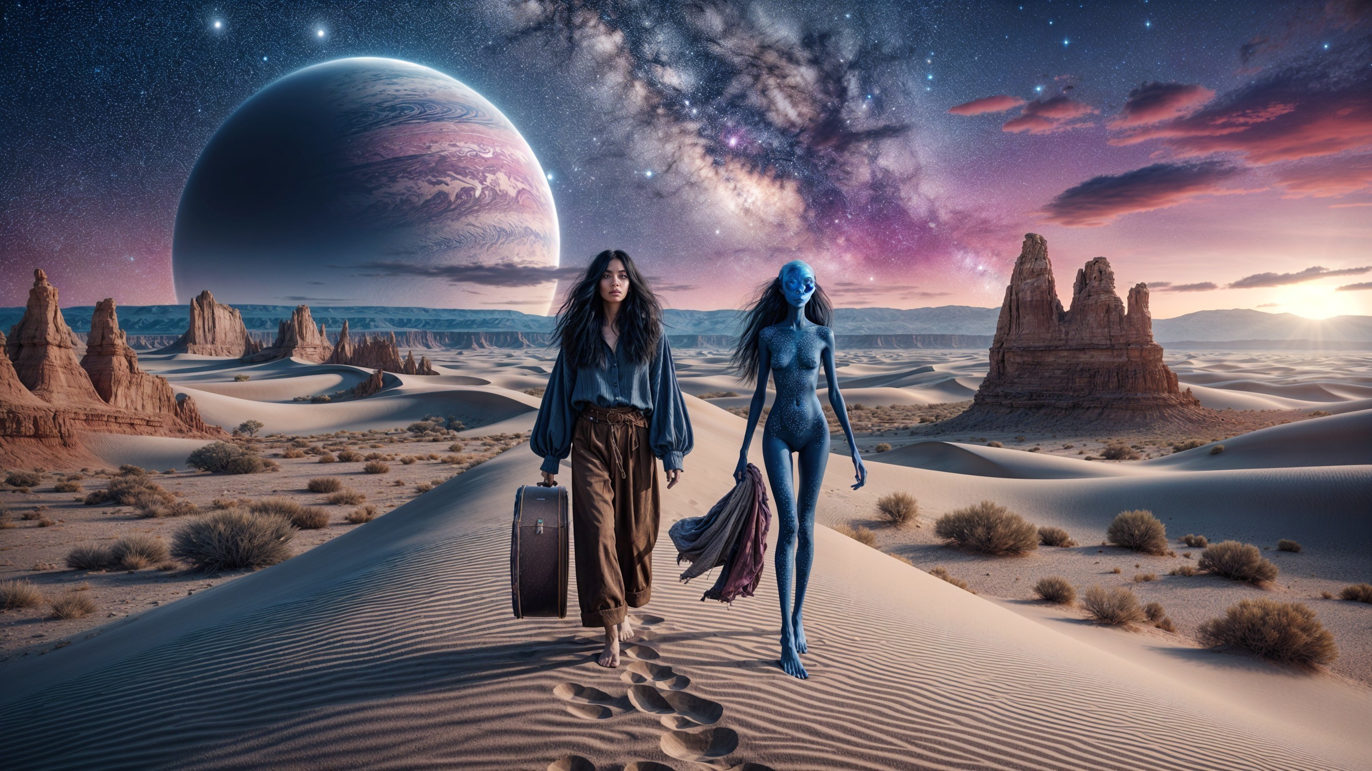 In a surreal desert landscape, a woman in a blouse and pants walks alongside a blue-skinned figure in a flowing red dress, under a cosmic sky with distant planets and rock formations.