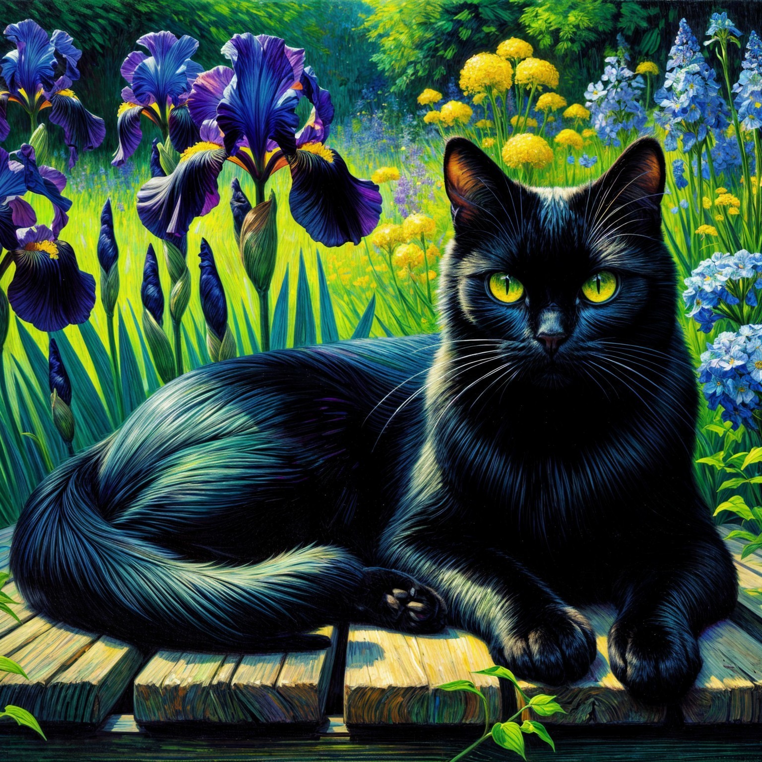 A sleek black cat with striking green eyes lounges on a wooden platform surrounded by vibrant flowers and lush greenery, evoking a serene and colorful garden scene.
