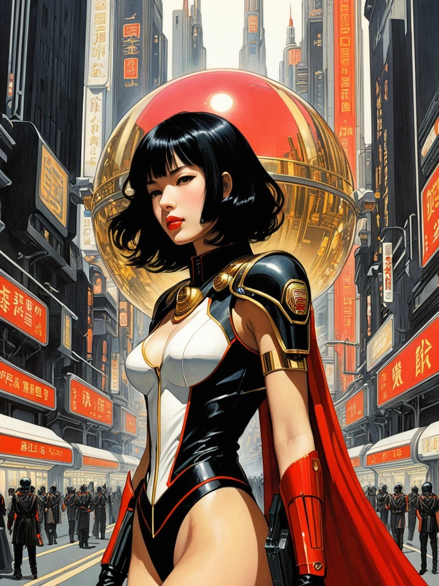 In a vibrant futuristic city, a confident woman in a sleek armored outfit stands before a massive golden sphere. Neon lights and bustling crowds fill the streets, creating a dynamic atmosphere.
