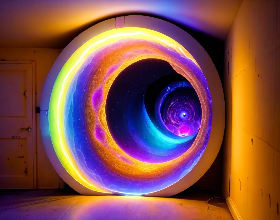 A vibrant portal with swirling cosmic patterns opens in a room, blending surreal space elements with mundane domestic surroundings.