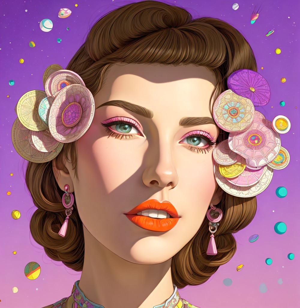 Pop art portrait of gorgeous teenage temptress surrounded by cosmical details, comical sketch art, geometrical illustrative style merged with storybook illustration, triadic color scheme pink beige purple, style of Geof Darrow and Overton Loyd and Didier Lourenço, line-art, comical horror, raytraced shadows, intricate lineage illustration, stylized illustration inspired by grant wood, 3d effects 1.8, ambient occlusion 1.3 anisotropic filtering 1.2, raytraced shadows 1.7, subtle, triadic color scheme yellow brown pink, comical, high coloring,, blonde flowing hair in zentangle method, ferocious, coherent, fiery, symmetrical, muscular, highlighted, raytraced shadows 1.2, heretic, traumacore 1.2, retrofuturistic, retropunk, incensed, translucent details, stylized illustration 1.8, dethereal, dynamic beige lighting 1.7, soft rounded edges, myted limited pallet, coffinwood 1.2, saturated colors, coherent,ferocious, abstract illustration, Radiance, brightness 1.2, 8k, devilish eyes 1.7, american gothic 1.7, plasticity 1.9, dimmed lighting, scales, shadow mapping 1.3, very colorful, abstact, concept art, mystery essence, ambient occlusion 1.5, layered geometrical vector art, vector 9:5, zentangle method, iridescent fractal accents in background, high coloring, brushed textures, vibrant colors, fauvistic, marvel comic book art, intricate ornamental details 1.9, octane render, Geometrical, lavish, serene, frankly, fauvistic,