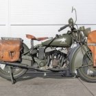 A classic 1942 Indian 500cc 740 Scout Military motorcycle with a green finish and star decals, featuring brown leather saddlebags and seating. Its vintage design includes chrome detailing, giving it a distinctive retro aesthetic.