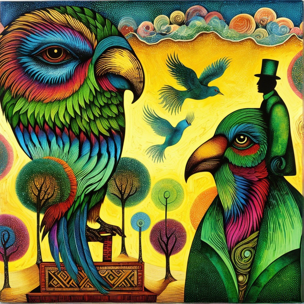 Artistic Statement: This piece takes inspiration from modernist and folk art traditions, with a vibrant palette reminiscent of Gaudí’s mosaic style and Paul Klee's playful geometry. The intricate patterns, bold colors, and stylized natural forms embody a fusion of symbolism and abstraction, inviting viewers to ponder the dialogue between these surreal bird figures.