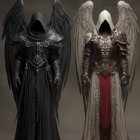 Two majestic figures stand side by side, clad in intricate armor with flowing cloaks. They possess large, shimmering wings and an aura of power, set against a dramatic, mystical background.