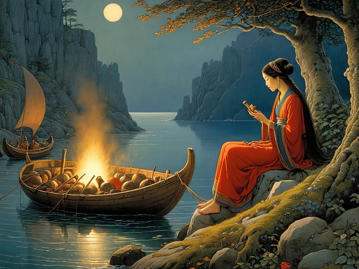 The serene scene depicts two women near a tranquil lake at dusk. One prepares food on a boat, while the other sits by the shore, dressed in a flowing red gown, surrounded by majestic cliffs.