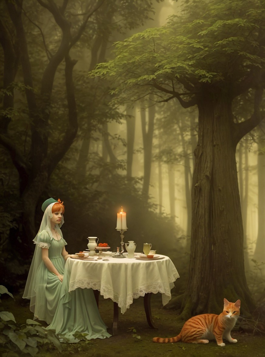 A young woman in a soft green dress sits at a forest table set for tea, with candles and pastries. A curious orange cat lounges nearby, surrounded by misty trees.