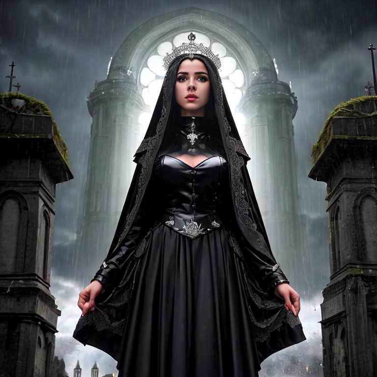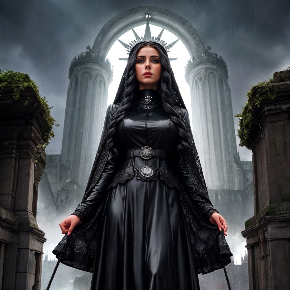 A regal woman in a black, ornate gown and headdress stands before a misty, medieval castle backdrop.