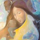 A serene young woman with long, flowing hair gazes gently at a warm light in her hands. Ethereal white birds flutter around her, enhancing the dreamlike, magical atmosphere of the scene.