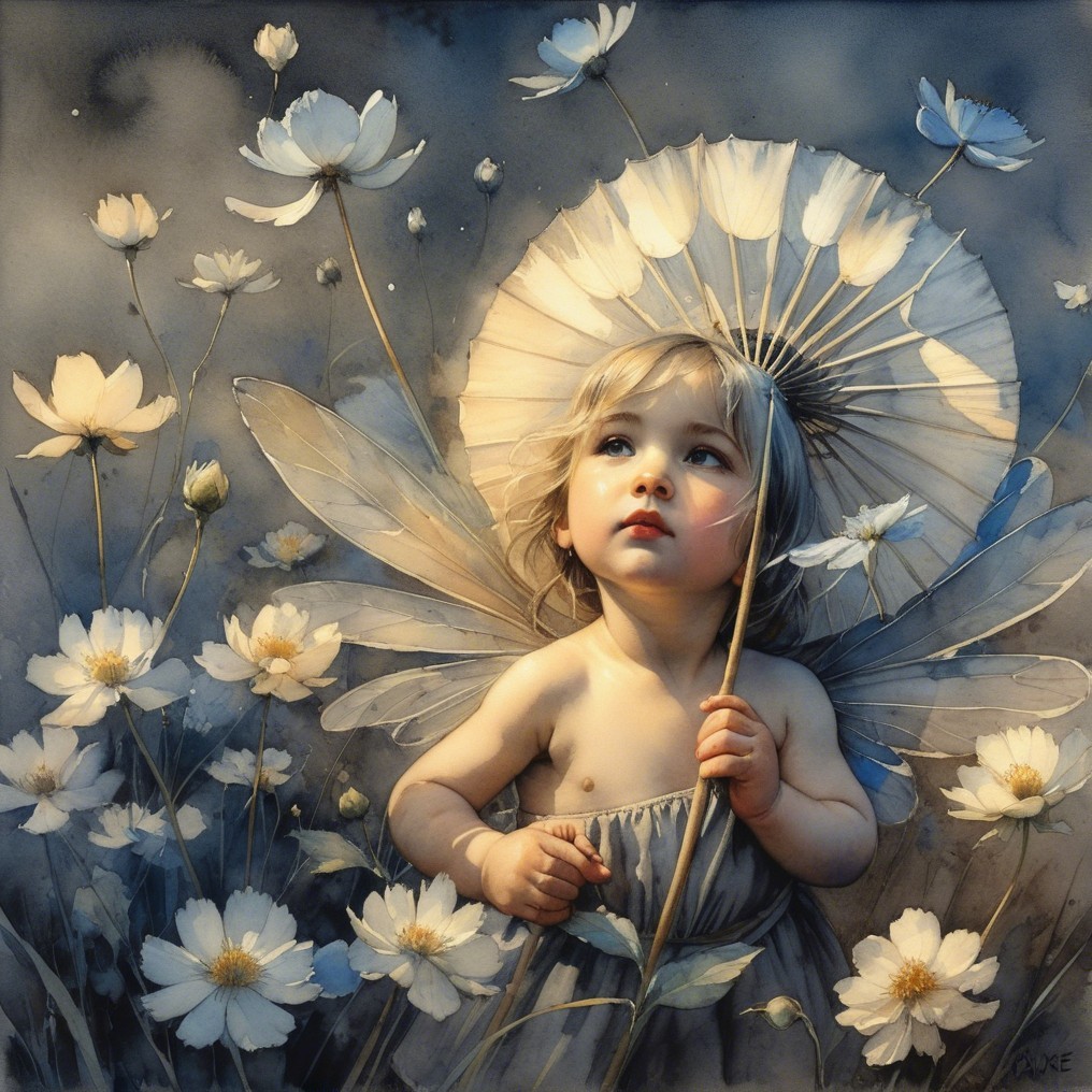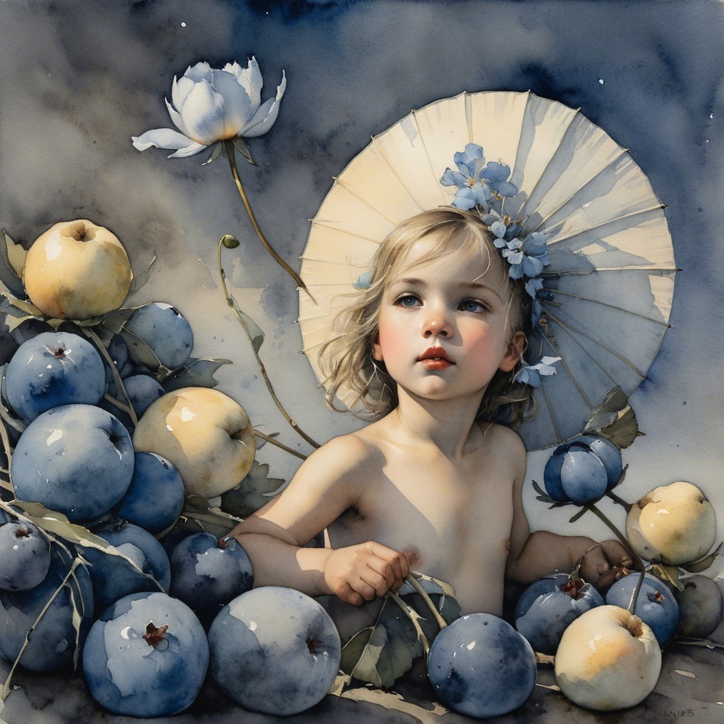 A serene portrait of a young woman adorned with blue flowers, surrounded by blue and orange spheres, with gentle pastel tones and a glowing moon in the background, evoking a dreamy atmosphere.