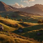 A picturesque landscape featuring rolling green hills, vibrant autumn trees, and majestic mountains bathed in warm golden light, creating a serene and tranquil atmosphere at sunset.