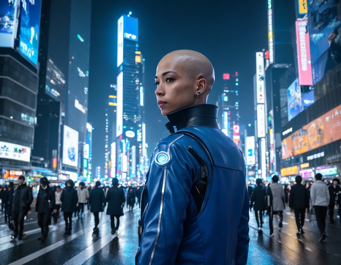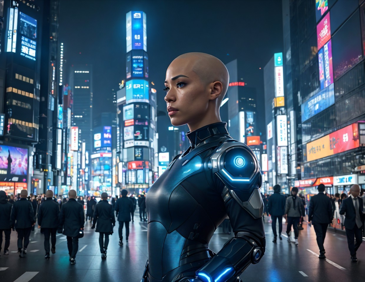 A bald, cybernetic humanoid stands in a neon-lit cityscape at night, embodying a futuristic, sci-fi ambiance.
