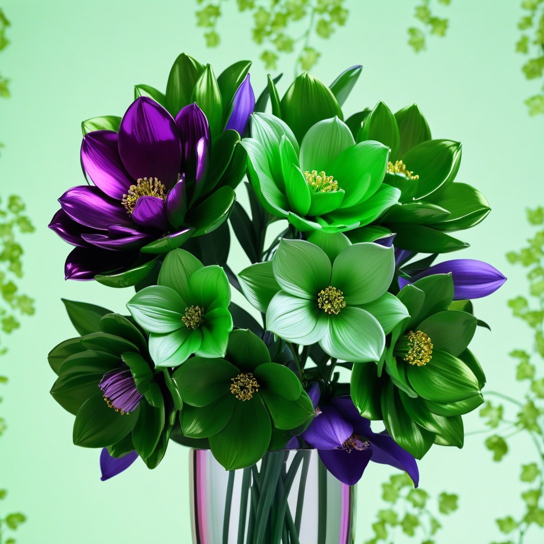 A vibrant bouquet of glossy flowers in shades of purple and green, arranged in a clear vase, against a soft mint green background adorned with delicate, shimmering gold details.