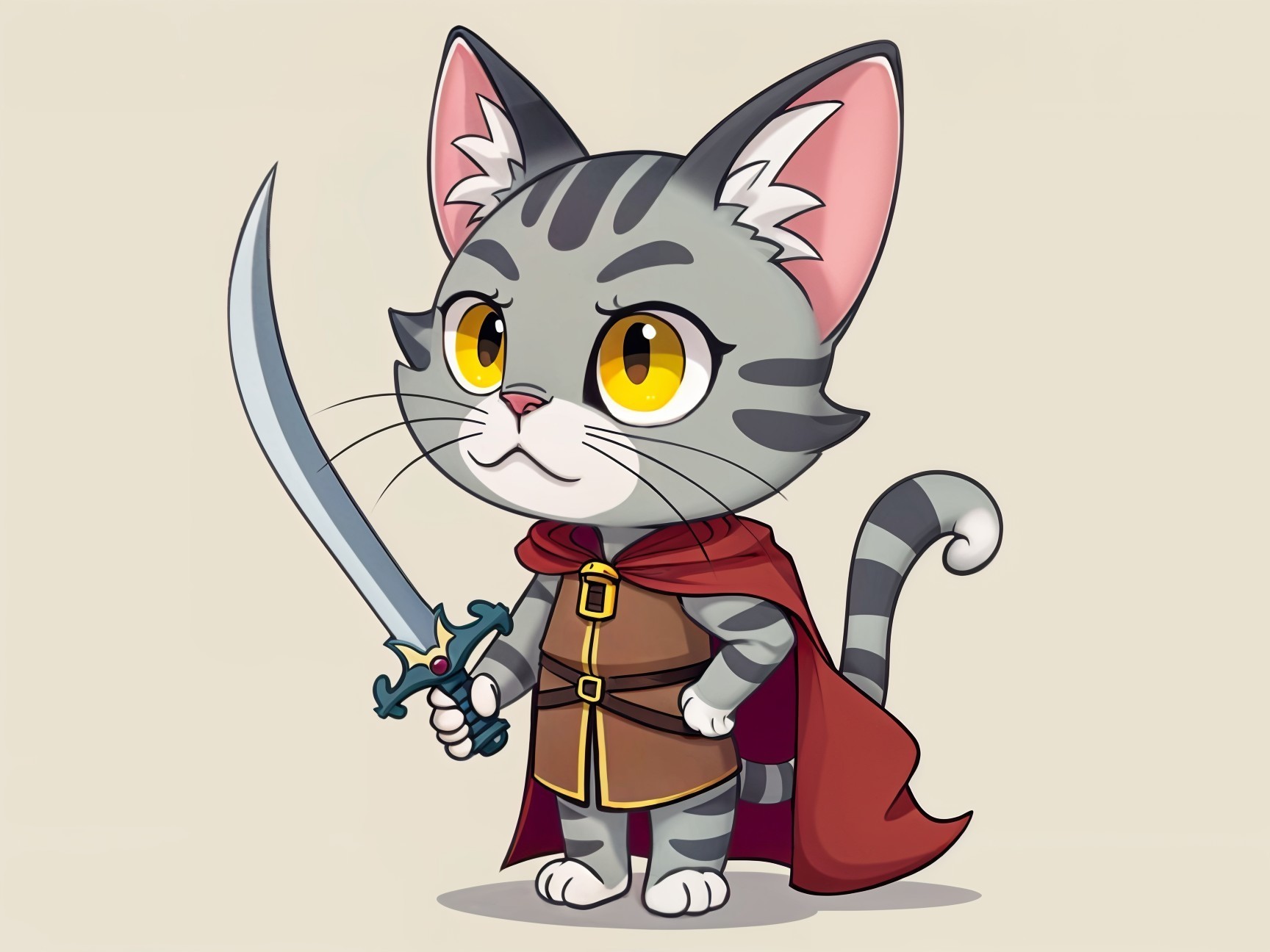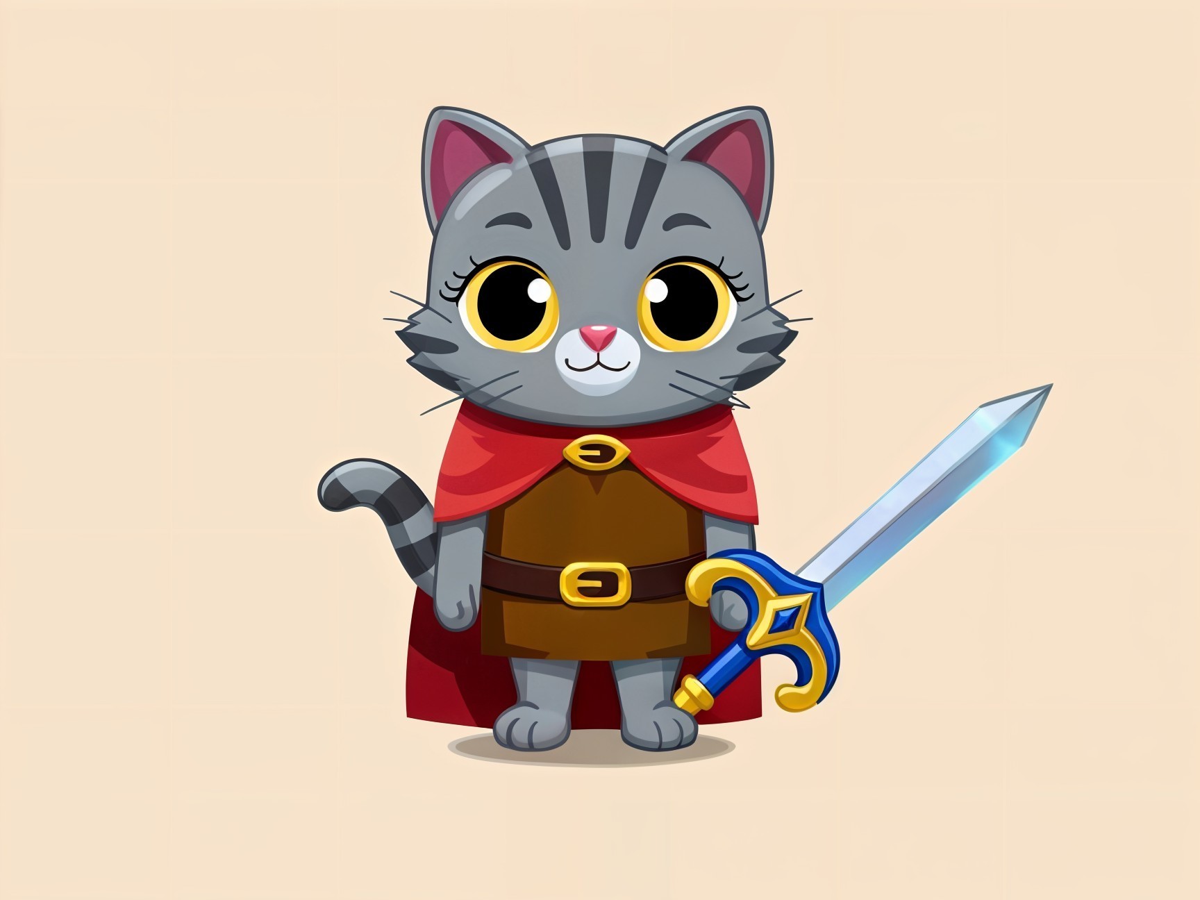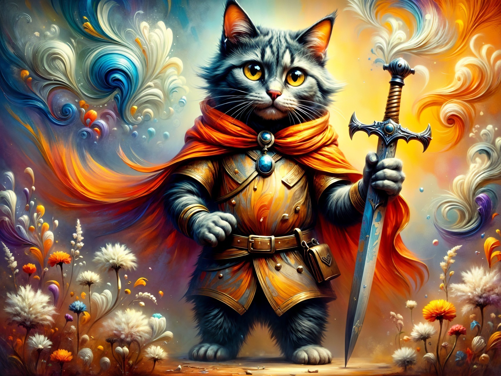 A majestic grey cat in ornate armor, wielding a sword, stands confidently against a backdrop of swirling flowers and soft colors, exuding a regal and heroic presence.