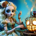 The image features elegantly styled dolls dressed in luxurious aqua gowns, adorned with jewels. Their striking makeup and intricate details create a captivating, fantasy-inspired atmosphere.