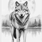 A majestic wolf stands confidently in the foreground, illuminated by a full moon. The scene features mountains and a forest reflected in calm water, creating a serene and powerful atmosphere.