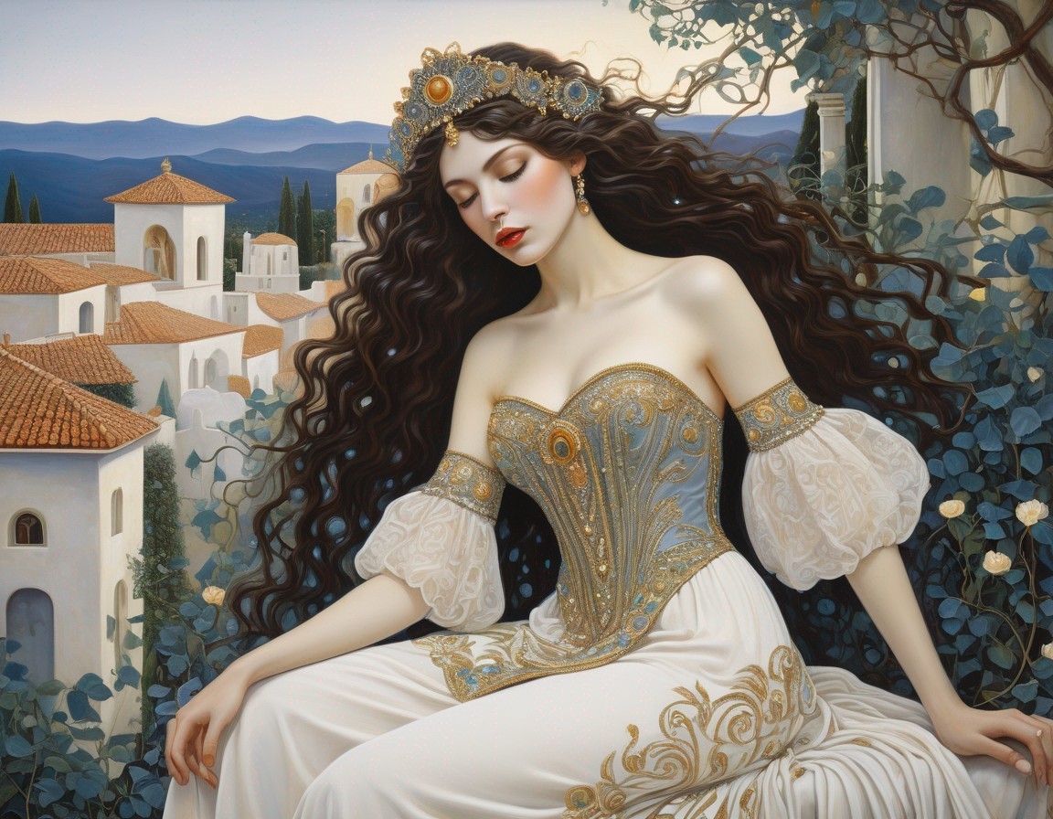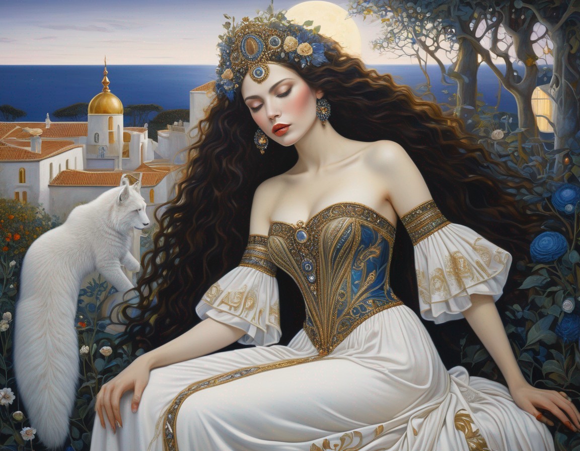A painting of a woman with dark hair and a white flower crown, flanked by two white cats, with a moonlit castle in the background.