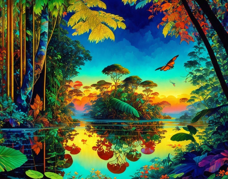 A vibrant, colorful illustration of a tropical forest with dense foliage, reflecting on a tranquil river at sunset.