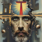 A surreal portrait of a man with striking green eyes and a prominent beard. Above, a bright red "T" and abstract elements float, creating an ethereal atmosphere blending reality and imagination.