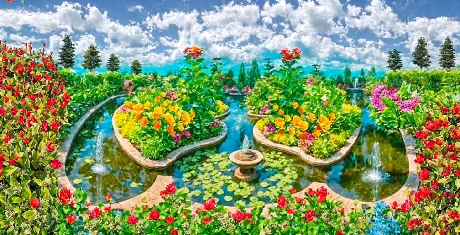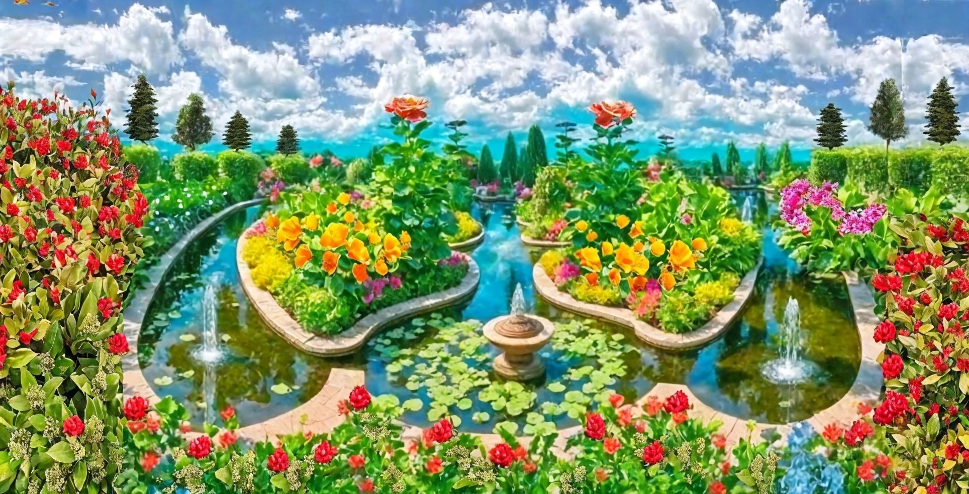 A vibrant garden with a pond, colorful flowers, and a blue sky with fluffy clouds.