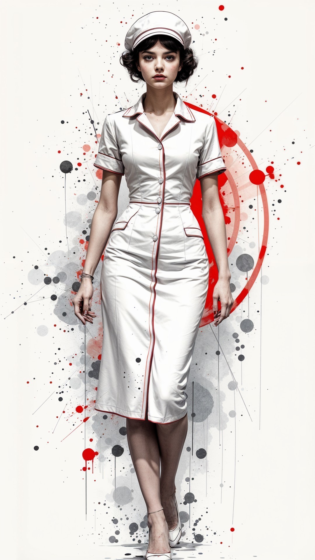 A full body, vertical shot of a woman with short brunette hair standing on a white background with red, grey, and black abstract circles and splatters. She is wearing a vintage white short-sleeved nurse dress with red piping and buttons, along with a matching nurse cap. She also wears white