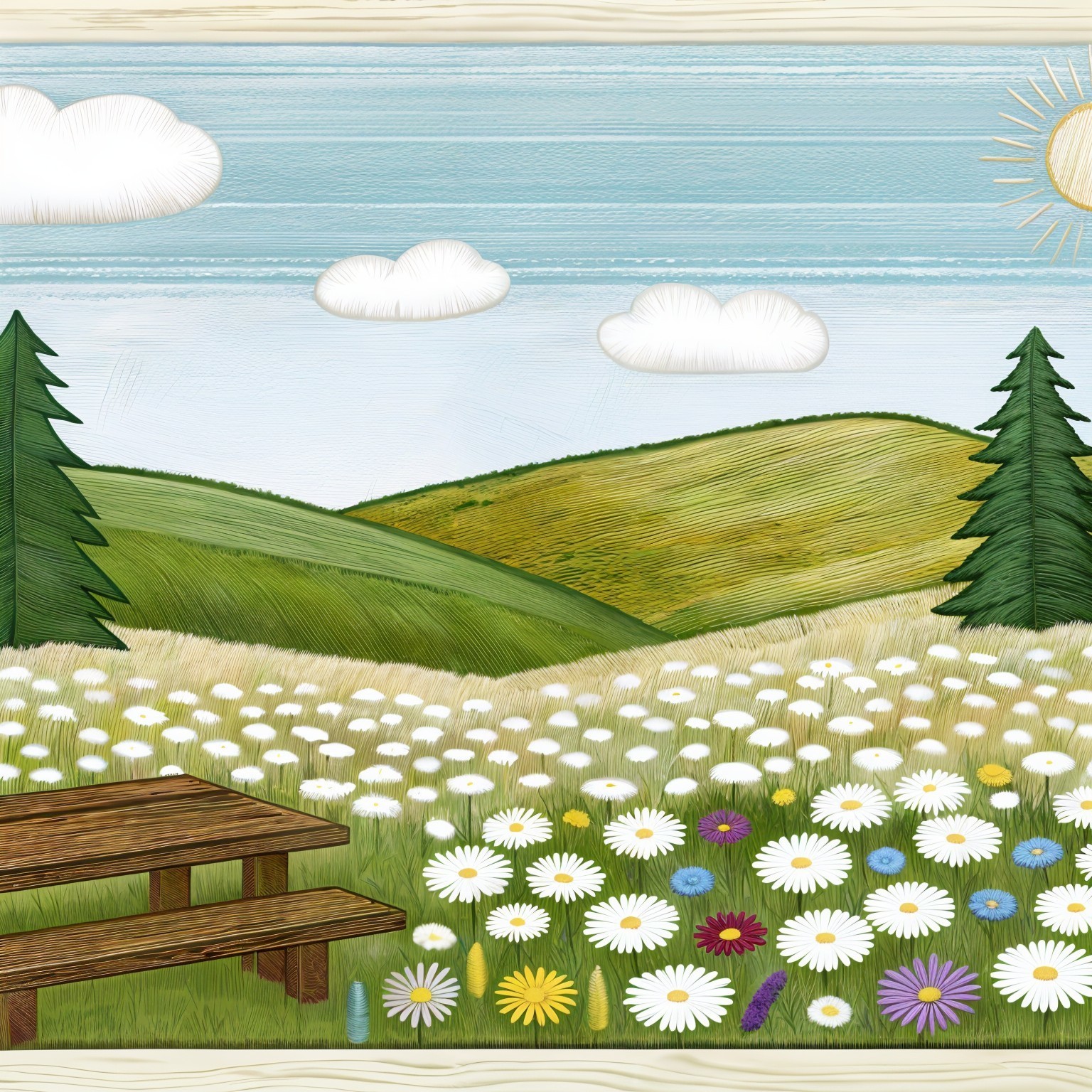 A colorful embroidered landscape featuring rolling hills, vibrant flowers, and tall evergreen trees. A sunny sky with fluffy clouds and a picnic table enhance the serene, cheerful scene.