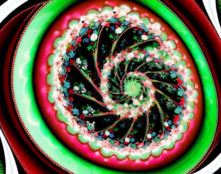 A vivid fractal image with a swirling pattern of greens, pinks, and whites, resembling a floral and cosmic fusion.