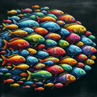 A vibrant, abstract depiction of a school of colorful fish swirling together. The image features a mosaic of hues, with sparkling bubbles adding a whimsical touch to the underwater scene.