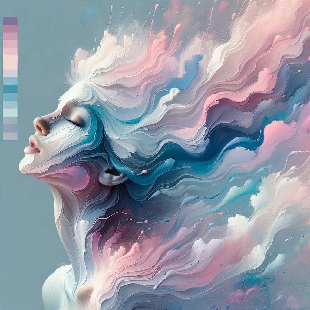 The artwork features a stylized female figure with flowing hair, blending vibrant pastel colors. The ethereal design emphasizes movement and emotion, complemented by a color palette on the side.